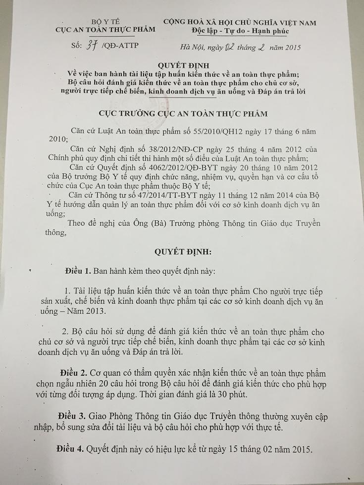 Ban hành kèm theo quyết định này là Tài liệu tập huấn kiến thức về an toàn thực phẩm cho người trực tiếp sản xuất, chế biến và kinh doanh thực phẩm tại các cơ sở kinh doanh dịch vụ ăn uống và Bộ câu hỏi- đáp án trả lời đánh giá kiến thức về an toàn thực phẩm cho chủ cơ sở và người trực tiếp chế biến, kinh doanh thực phẩm tại các cơ sở kinh doanh dịch vụ ăn uống.
