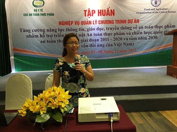 Ngày 05-06/12/2015 Ban quản lý Dự án “Tăng cường năng lực thông tin, giáo dục, truyền thông về an toàn thực phẩm nhằm hỗ trợ triển khai Luật An toàn thực phẩm và Chiến lược quốc gia an toàn thực phẩm giai đoạn 2011-2020 và tầm nhìn 2030" do FAO tài trợ đã tổ chức Lớp tập huấn nâng cao nghiệp vụ trong quản lý dự án, chương trình có tài trợ của nước ngoài cho các thành viên ban quản lý dự án